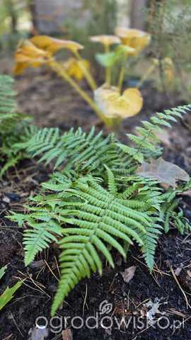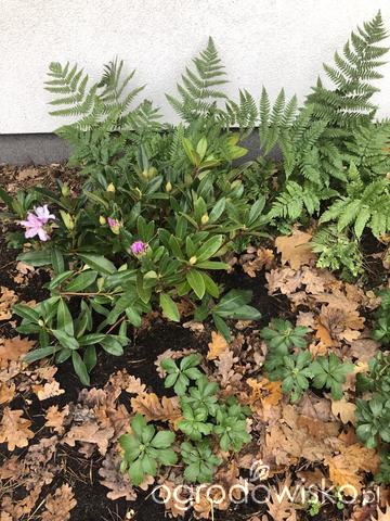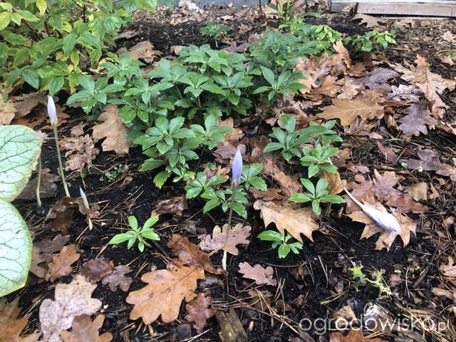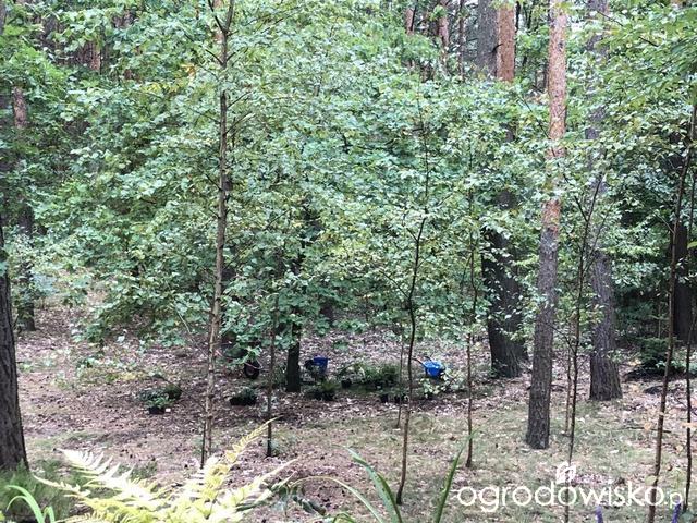 Dziś posadziłam większość roślin - one czekały jeszcze z czasu, kiedy było ciepło i pogoda zachęcała do zakupów, ale chorowaliśmy trochę i dlatego tak się zeszło. A wszystko dlatego, że sobie umyśliłam, żeby pod ładnym dębem na skraju ni to polanki, ni to brzozowego zagajniczka stworzyć łany krokusów. Ale jak już wetknę cebulki krokusów, to nie będę mogła nic tam innego sadzić, żeby ich nie powywracać w ziemi, więc na szybko trzeba było najpierw nakupić i nasadzić bylin w tamtej okolicy. Miejsce trudne, bo pod dębem właśnie, ale mam nadzieję, że dadzą jakoś radę... Głównie paprocie, a oprócz nich hosty, ciemiernik, ułudki, miodunki, jasnoty, zawilce jesienne i epimedia. Na zdjęciu widoczne jeszcze w doniczkach - widok z tarasu, na pierwszym planie rośliny tarasowe, dalej polanka vel brzezina i rzeczony dąb z rozstawionymi pod nim w grupach doniczkami