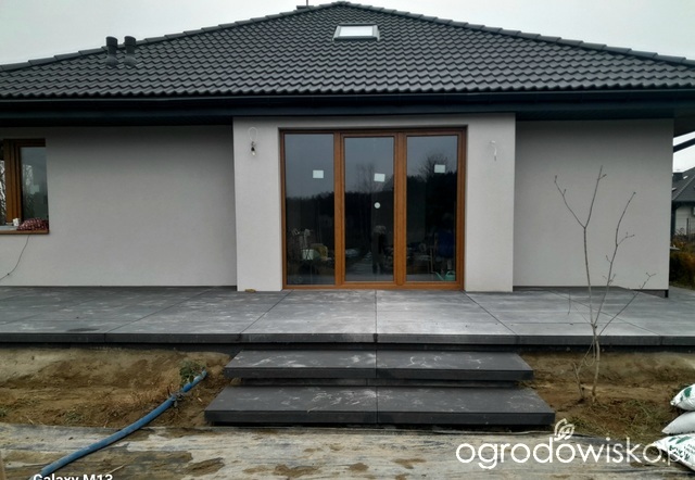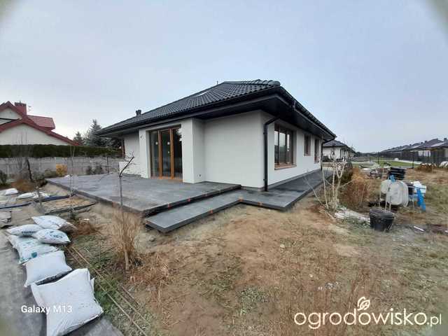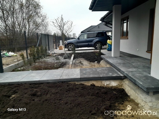 Wzdluz podjazdu i przed kotłownią. W tle wejście do piwniczki, jeszcze nie ogarnięty teren po pracach brukarskich. Panowie jeszcze zostawili część sprzętu.