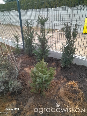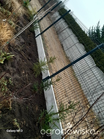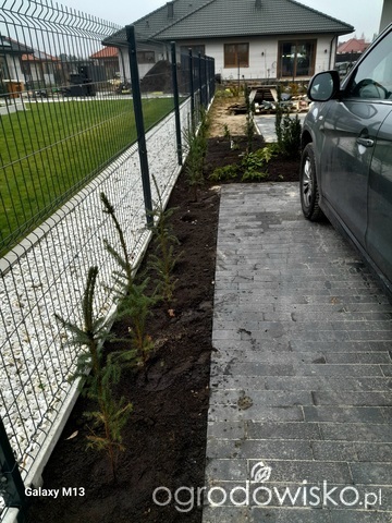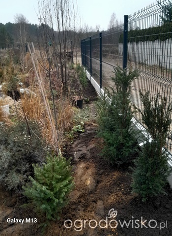 Wzdłuż drogi. Czekam na nieco podobno cieplejsza sobotę, żeby opielic do końca ten kawałek (na długości jednego przęsła). Wtedy dowiozę tam trochę ziemi i dosadzę żywopłot. W przerwy między swierkami dojdą choiny kanadyjskie, które mam do rozsaszenia, bo rok temu posadziłam je za gęsto.