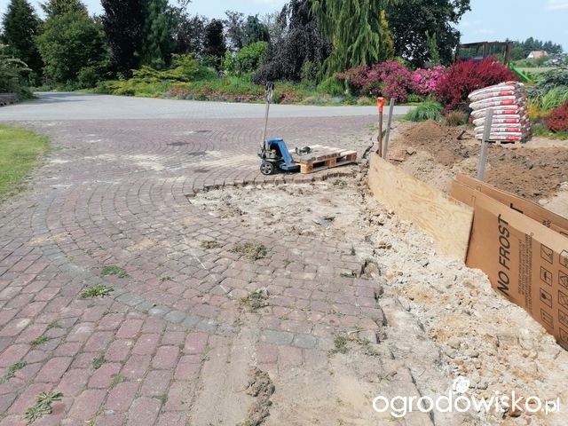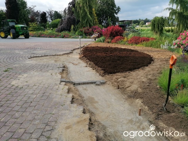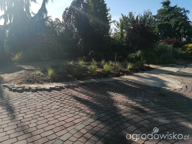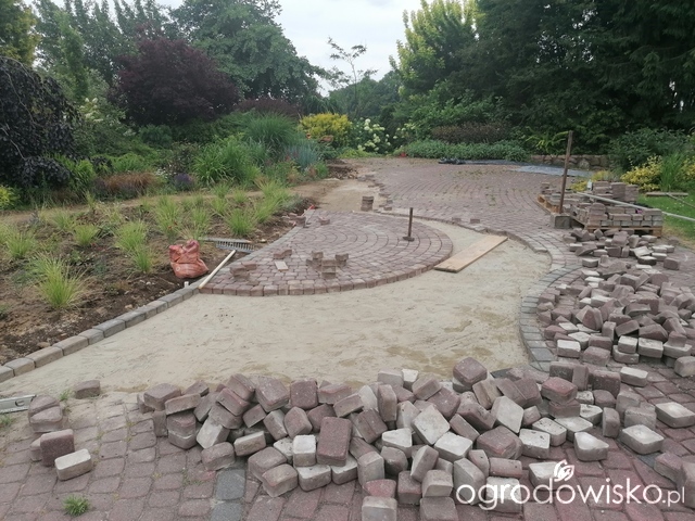 W czerwcu ub. roku zapadła decyzja: działamy. Poniższe zdjęcie obrazuje ideę: zamknąć rabatą największe koło ułożone z kostki. Tu wydeptany śnieg (2022)