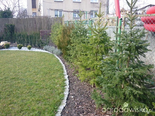 Przekompostowana kora sosnowa nie zaszkodzi świerkom. Możesz sypać, aby nie świeżą. Ja bym nie cięła, niech rosną póki co.