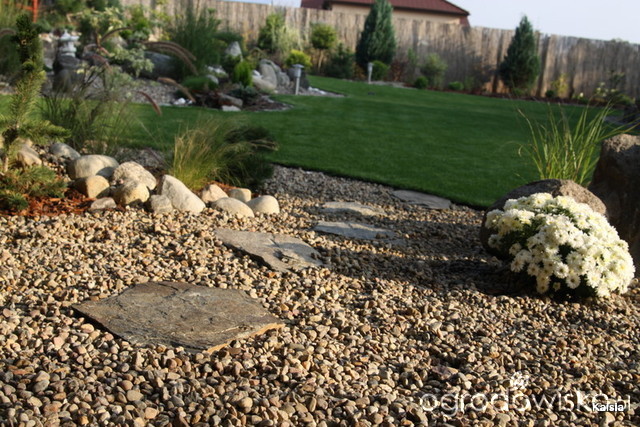 W ogrodzie jest dużo kamienia, żwirowe nawierzchnie, powstał również suchy strumień który zaczyna się pod mostkiem.