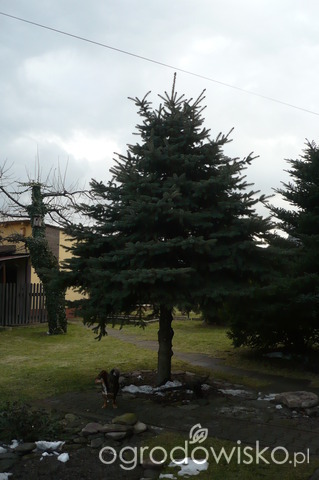 (na dzisiaj). Zdjęcie iglaka przy schodach wejściowych - rośnie tam kilka lat ale niewiele. Jak widać przyrasta niemało... Na razie się mieści - jednak niektóre gałęzie zaczynają już przechodzić przez balustradę na schodach. Jeszcze "chwila" i znowu będzie problem że jest zbyt wielki i rozłożysty... Czy można już teraz dokonywać jakiegoś cięcia żeby na jakiś czas go okiełznać i nie mieć problemu za rok czy dwa?