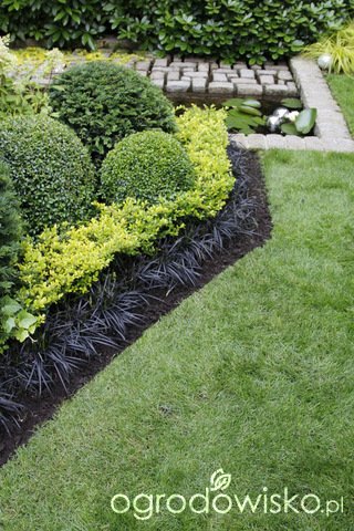Ogród z lustrem str.52 "To są ostrokrzewy Ilex crenata "Golden Gem", jak u mnie w ogrodzie przy stawie"