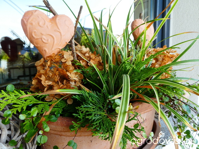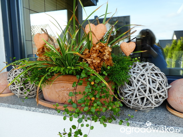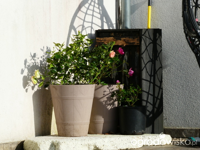 Róże w donicach przygotowane do zimowania w kącie tarasu