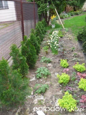 Długa rabata wzdłuż domu. Do przeróbki. Za dużo gatunków, za duży galimatias. Ni ładu, ni składu