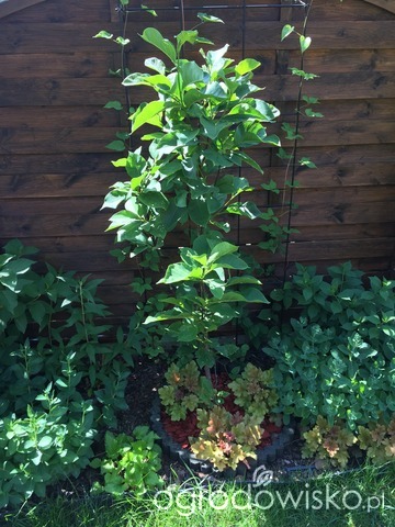 Posadziłam ją wiosną, od tego czasu trochę urosła i obecnie ma już ponad 2 m. Odmiana 24 Below wytrzymuje ponoć spadki temperatur do - 31'. Dotyczy to oczywiście dorosłych roślin, młodsze egzemplarze należy okrywać. Zimozielona magnolia chodziłą za mną już długo. Skusiłam się kiedy na naszym rynku pojawiły się nowe odmiany o podwyższonej mrozoodporności i ciekawych pokrojach (są też np. kolumnowe). Podchodzę do uprawy grandiflory ze sporą dozą dystansu, traktując ją jako eksperyment (choć także z pewną nadzieją, bo uprawiam z sukcesem w gruncie bez okrycia m.in. paulownię, cedr libański, czy aucubę). Zobaczymy jak sobie poradzi zimą. Tak jak w przypadku zimozielonych rododendronów, tak i przy grandiflorze trzeba pamiętać o jej zapotrzebowaniu na wodę rownież zimą. Stanowisko wybrałam jej osłonięte, rośnie między domami na ścianie południowej. Gleba lekko kwaśna. Nie nawoziłam jej w tym sezonie, a przyrosty miała dosyć spore. Liście ma piękne, duże, grube, błyszczące, jak u fiskusa