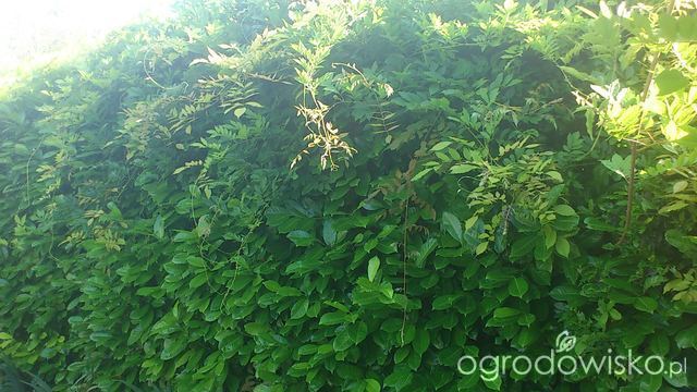 jakiez bylo moje szczescie gdy okazalo sie,ze moja "zielona" sciana to krzewy, ktore nie zrzucaja tych wyjatkowych lisci na zime i jednosczesnie fantastycznie wygladaja porosniete stara wisteria, ktora po calej dlugosci opsypuje sie w maju kwiatami, ktorych fiolet idealnie kontrastuje z piekna zielenia...