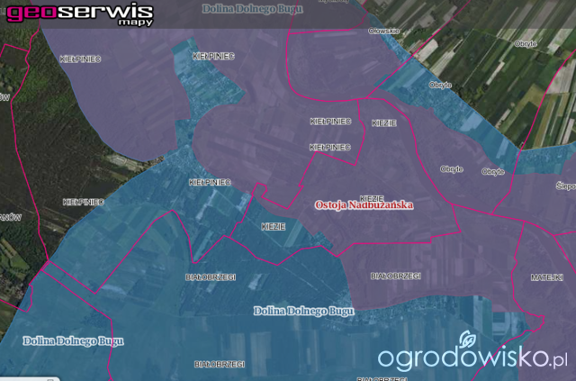 Te same wsie - obszar Natura2000 - swa kolory, bo dwa obszary: Dolina Dolnego Bugu i Ostoja Nadbużańska.