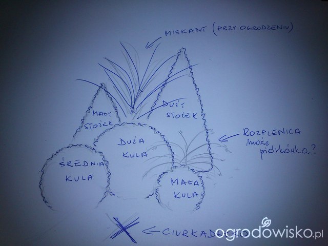 po obu stronach ciurkadełka przed bukszpanami ja zrobiłabym zawijaski tak jak chcesz, może z bordowych żurawek (do różu, fioletu pasują, zawsze można dobrać odpowiednie jest sporo odmian) lub srebrnych niskich turzyc też ich sporo. Wkomponowałabym tutaj delikatnie kolor, żeby nie było zbyt jednolicie...myślę dalej.