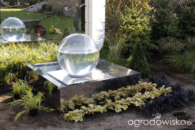 Rozpoczęliśmy obsadzanie okolic szklanej kuli. Mam cały czas związane ręce, bo nie mamy jeszcze kul szklanych do położenia w rabatę, będą one umiejscowione pomiędzy kulkami z bukszpanu, a trawkami.