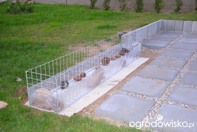 Gabionowa ścianka-ławka, zamyka placyk. Gabion w trakcie wypełniania.