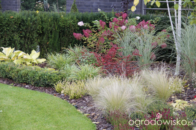 Potem zaplanuj nasadzenia (kolorowe niskie berberysy ze 3 gatunki lub odmiany, irgi, trzmieliny "Emerald'n Gold"). Sadzone wielkimi plamami. Może nawet trawy? Też będzie pięknie.