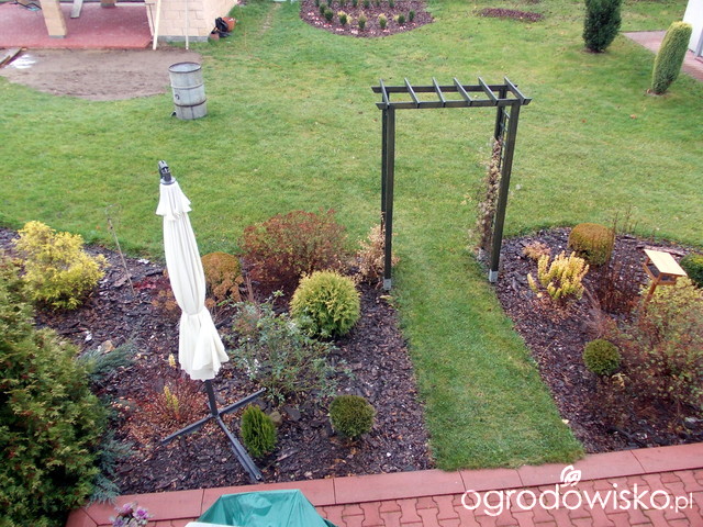 Te rabaty powinny być spójne z tym co jest w okolicy altany, za dużo tu wszystkiego no i te pojedyncze iglaki po prawej też trzeba coś z nimi zrobić
