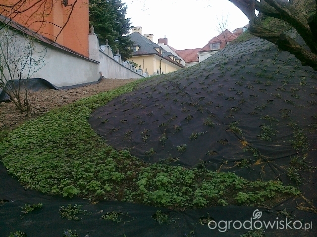 a tu skarpa z drugiej strony obsadzona też barwinkami a w tle irgi, przy samych drzewach bluszcze, ale jeszcze ich nie widać. nasadzenia są niewielkie bo robione jesienią ale już wkrótce ruszą i będzie mam nadzieję pięknie