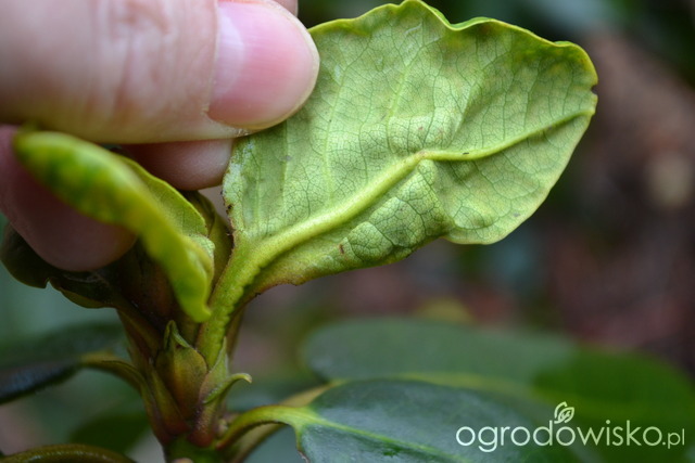 A teraz brzydsze widoki - poszłam pooglądać mojego rh - czy na nim coś aby siedzi czy nie siedzi - nie zauważyłam żadnych stworków... Wyłamię te gałązki tylko jakoś na razie się obawiam czy nie za wcześnie - zauważyłam, że przy każdym takim brzydkim pąku tworzą się nowe pąki boczne i to po kilka na gałązce. Tak wyglądają te chore liście od spodu... Może Wy wypatrzycie czy coś go zaatakowało...