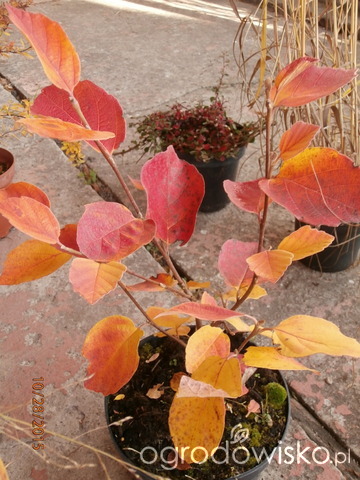 ona gubi liście ale zostają jej owoce kuleczki i jest gęsta zwarta patyk na patyku wiosna jest zielono biała i później kwitnie na takie drobne kwiatuszki różowe zewnątrz białe w środku