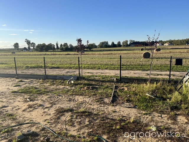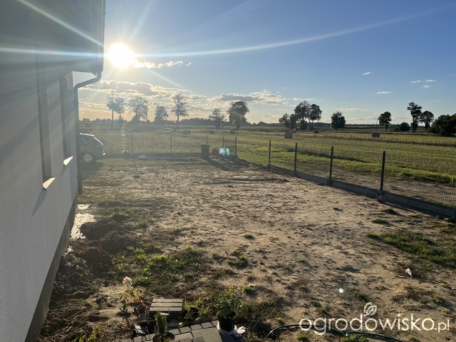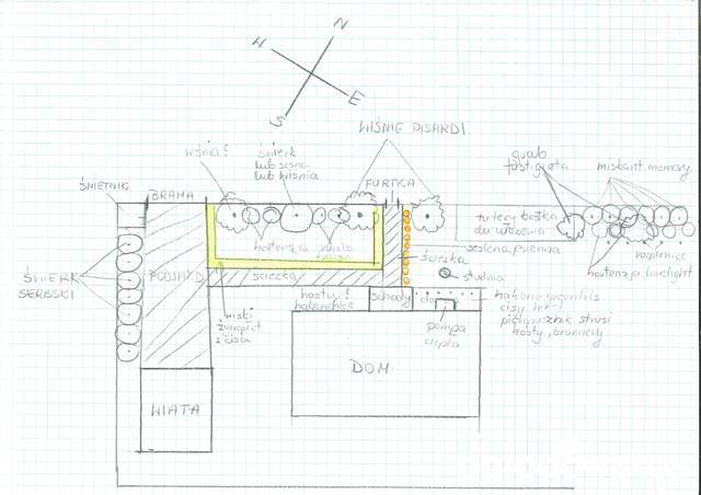W centrum rabaty wiśnia piłkowana kazań, pod nią niższe hortensje, trawy rozplenica hamen i obwódką z cisa. Brakuje mi czegoś zimozielonego z prawej strony...