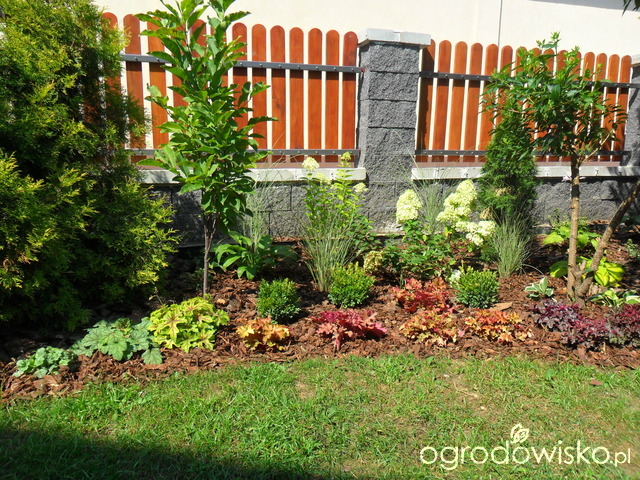 Męczą cię pewnie te duże kamienie. Zabierz je, bo nie pasują odcieniem. Pomiędzy kamieniami, a korą zastosuj jakiś pasek rozdzielający.Trzmielinę i lawendę przesadź i będzie ok.