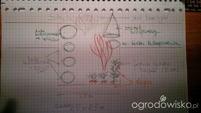 Jakoś tak wcześnie rano dziś wstałam i miałam chwilę na poprzestawianie roślin. Poniżej 2 wersje ustawień, czyli poniekąd wersja nr 1 i nr wersja nr 1 z klonem na środku [ do tej wersji nie wrzucałam rysunku].
