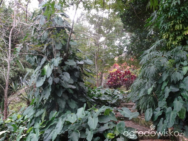 Ogród jest na zboczu wzniesienia. Trzeba się wspinać pod górkę. Uformowane są liczne tarasy.
