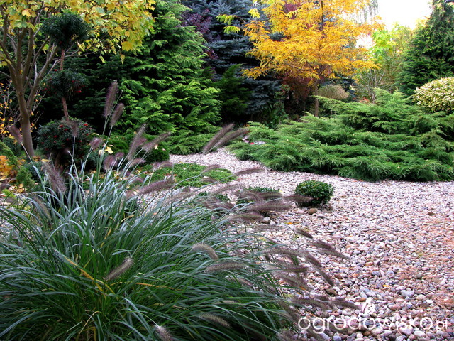 Cały czas coś się w nim zmienia, a to za sprawą ostrej zimy, a to nietrafionych roślin, moich nowych wizji …. Niektóre rośliny zmieniały swoje położenie kilka razy. Nawet żartowałam, mówiąc, że one „zwiedzają” nasz ogród. Jest on dobrze doświetlony, praktycznie promienie słoneczne operują w nim od wschodu do zachodu. Ale w miarę upływu czasu, z roku na rok mamy coraz więcej cienia, który daje małą ulgę w upalne lato. W ogrodzie przeważa roślinność zimozielona. Dla przełamania monotonii zieleni starałam się zagrać kolorem, tak aby nie trzeba było czekać na jesień, na porę roku, która to wprowadza nas w świat pełen barw. Począwszy od wiosny wśród iglaków i roślin zimozielonych liściastych, takich jak : ligustr, trzmielina o liściach żółtych i żółto-zielonych zaczynają kwitnąć krzewy oczaru, forsycji, leszczyny południowej, rośliny cebulowe (przebiśniegi, hiacynty, żonkile, tulipany), wrzośce, a później azalie, bergenie, różaneczniki, jabłonie, piwonie, róże, mieczyki, powoje, wrzosy, trawy i wspaniałe hortensje.