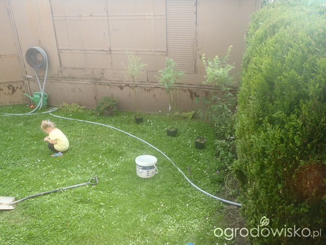 napracowałam się troszeczke... miałam dylemat gdzie posadzić trzmieliny a gdzie wierzby... nadal mam wątpliwości czy dobrze zrobiłam.... Do trzmielinek dosadziłam żurawki citronelki i inne bordowe, do tego dużo host i tawuły.... wszystko to co już na ogrodzie miałam. Na kratce ma sie wspinać bluszcz tak żeby ściana była zielona cały rok. Może będzie dobrym tłem dla trzmieliny a ta sama szybciutko urośnie
