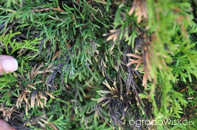 To jest jedna sztuka, rośną trzy koło siebie. W jednej linii i tylko z tej strony zrobił się czarny. Nie mam psa, czasem po działce przechadza się wiejski kot. Nie widziałem, żeby podlewał rośliny. Wąchałem i moczu nie wyczułem. Pojawili się u nas też wykonawcy, pracują na dworze, myślałem, że to złośliwość ludzka, ale chyba ludzki mocz też bym wyczuł.
