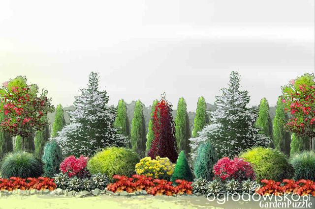 "dałam świerki srebrne lub jodłę koreańską" - moim zdaniem za duże jak na rabatę.. coś o powolnym wzroście, bo cie szlag trafi po 5 latach. Może świerk compakta, Białobok lub Maingold (śliczne wiosenne przyrosty, do żółtej rabaty pasują).