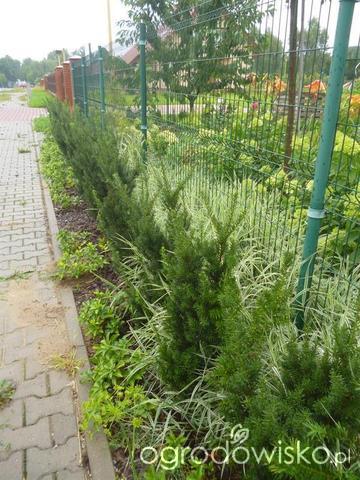 Od strony drogi rosna cisy, kiedys beda wysokie i rowniutkie i stworza bariere od drogi i zimozielone tlo od ogrodka, wisnie beda nad nie wystawiac korony