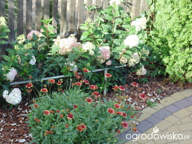 Na północnej stronie domu rośnie sobie nawłoć, jakieś żółte nie wiem, co i jarzębina. Są tam jeszcze szmaragdy, bergenia, szałwia omszona, forsycja, rudbekia, kany. Jedna rabatka trochę, jak w wiejskim ogródku.