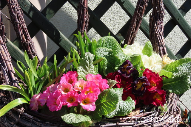 W doniczach posadziłam prymule i żonkile.