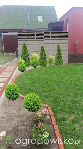 Pod płotem 3 szmaragdy i 2 kule bukszpanowe, może nawet i 3 ale wtedy od największej do najmniejszej( przy chodniku większa), dorzuciłem tam stipę dla zagęszczenia wszystkiego ale na pewno pojawi się coś kwitnącego.