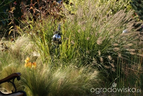 Mały fragment rabaty ze stipą, miłkiem, rozlpenicą Hameln, krokosomia Lucifer (ale odmiana niska), piwonia delikatna pełna, trojeść bulwiasta, w tle hakonechloa Nikolaus i jeżówki. Brakuje miesięcy, ale u mnie jak nic nie kwitnie to tego nie ma..