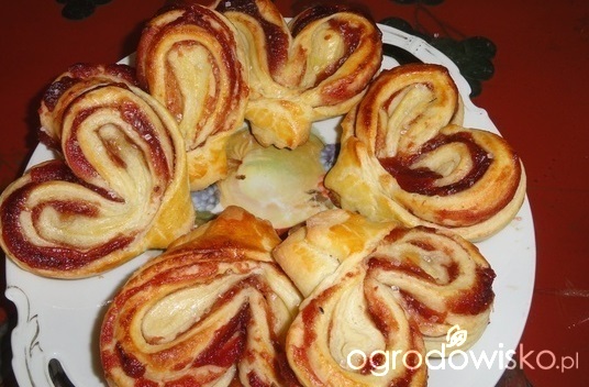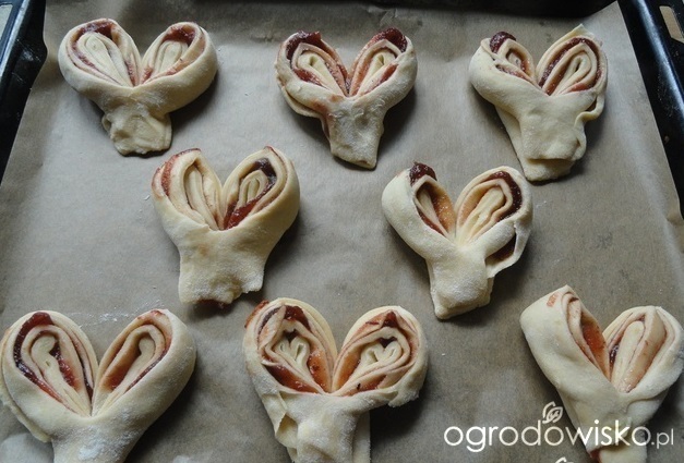 Ciasto wyjąć z lodówki i pokroić na 16 równych kawałków. Rozwałkowywać na placki (grube na około 6 - 7 mm), podsypując odrobiną mąki. Smarować dżemem i zwijać w rulon. Każdy rulon złożyć na pół i naciąć ostrym nożem od strony zgięcia do 3/4 długości. Rozłożyć ciasto tworząc kształt serca. Układać na dwóch blaszkach wyłożonych papierem do pieczenia.