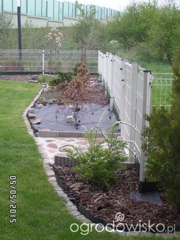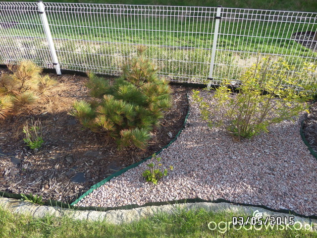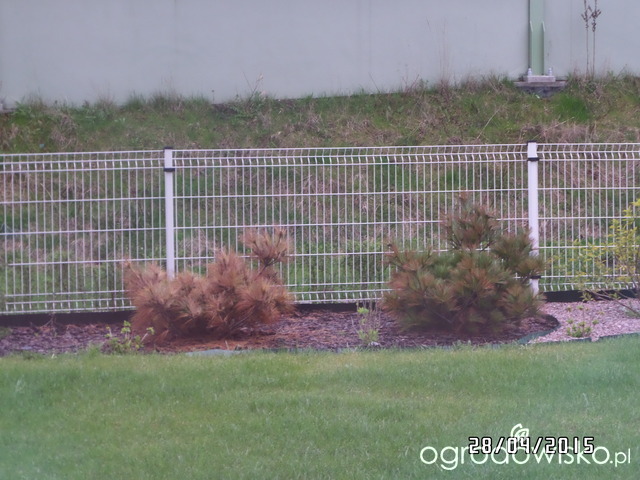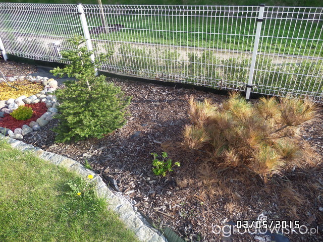 Po lewej jest jodła kor., a prawej jest bez. Przed sosnami są hortensje.