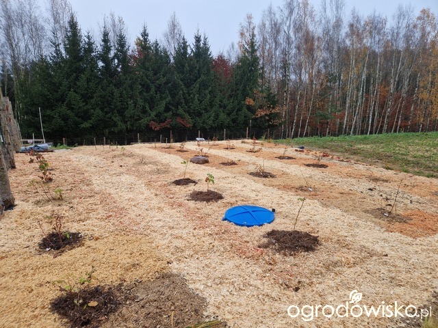 29 krzewów owocowych i 15 krzewinek, plus trochę truskawek i poziomek. Kilka traw ozdobnych żeby nie było nudno i sterylnie
