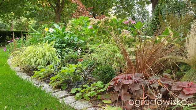 I połączenie brązowych carexów z rudymi żurawkami Marmoladę i Cherry cola.