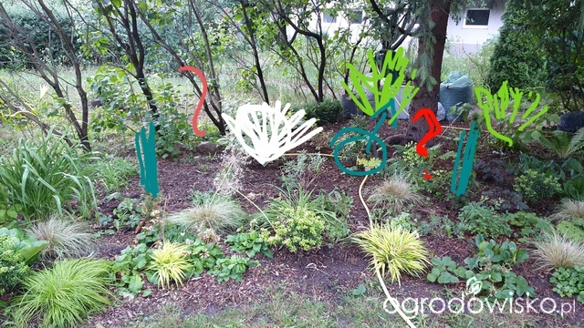 Jeszcze mam w innym miejscu derenia Ivory halo i myślałam, że pasowałby tam gdzie lewy znak zapytania czyli po lewej derenia Sibirica Variegata i je rozdzielić czymś zielonym i podsadzić ciemniejszym.