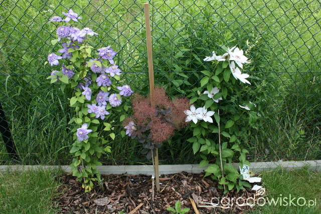 Clematis Blue Light, perukowiec podolski Royal Purple, clematis Matka Siedliska.