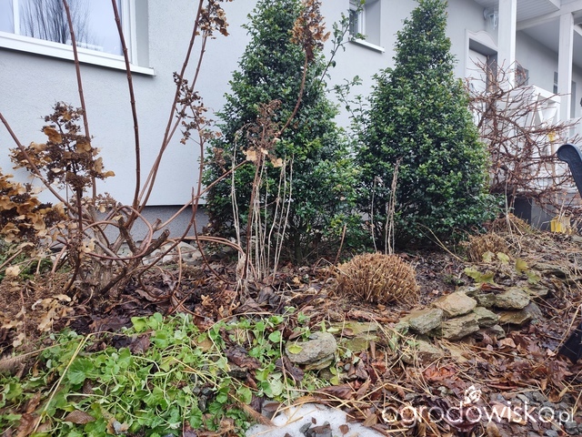 Prace zakończyłam cięciem rozplenic i imperat na rabatach frontowych.