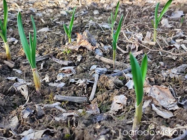 Na zewnątrz widać jedynie zielone listki czosnku jadalnego. Bardzo ładnie wykiełkował.
