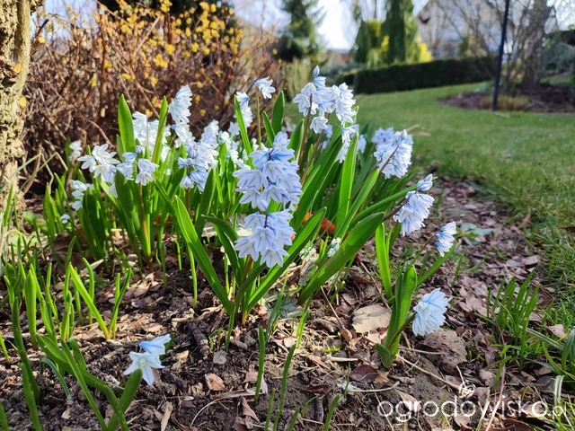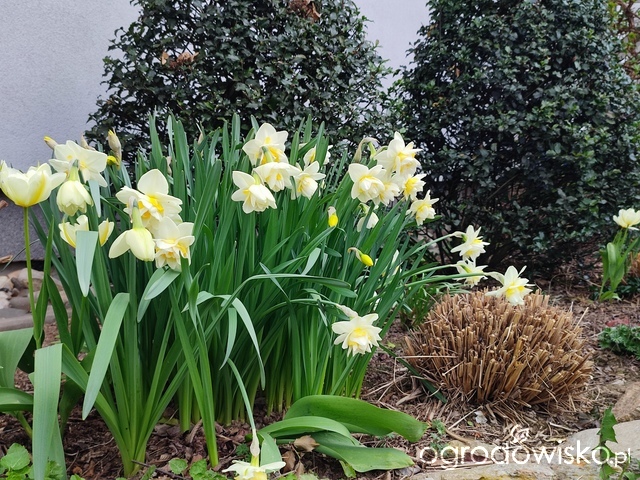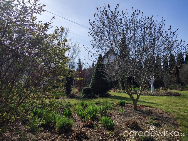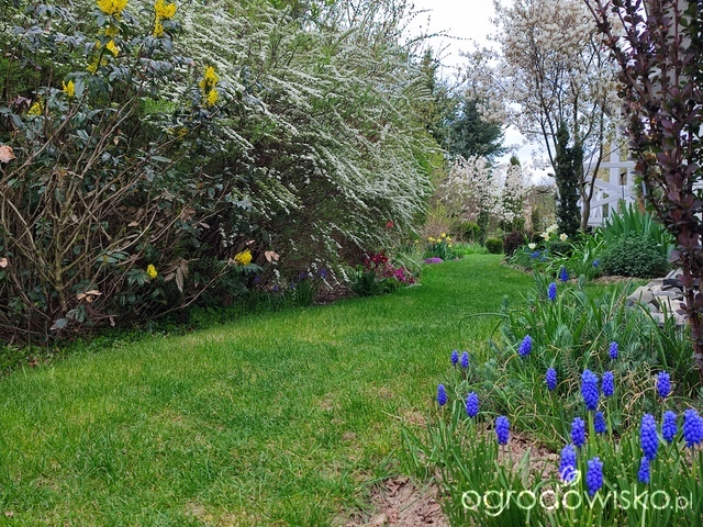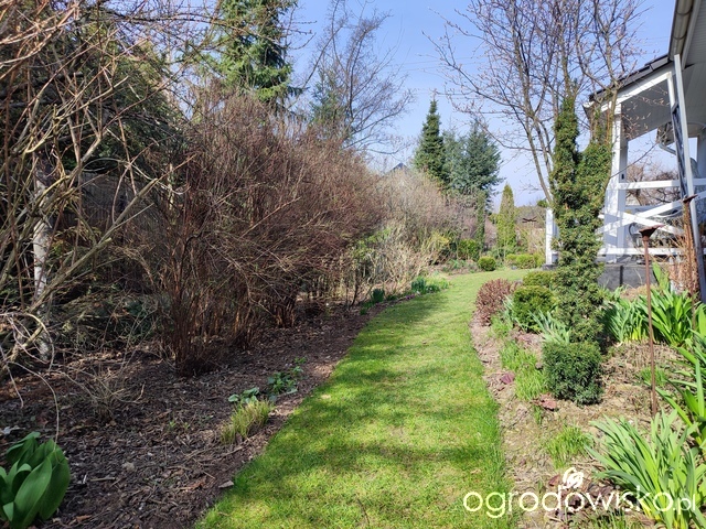 Po lewej stronie ścieżki kwitną mahonie i tawuły wczesne.