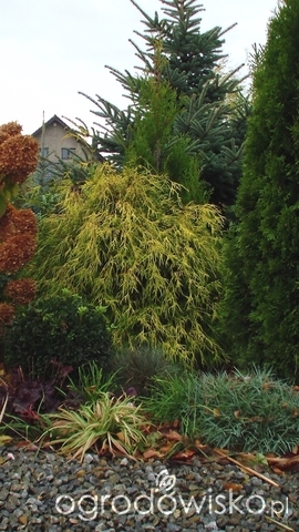 Z ronda wysadziłam klona pensylwańskiego. Bardzo szybko tracił liście, nie przebarwiał się urokliwie. Jego ciekawie prążkowana kora to za mało. Klonik znalazł miejsce w zakolu rabaty brzozowej. Musiałam poszerzyć całość rabaty zachodniej, aby znaleźć dla niego miejsce. Na rondzie wylądował mniejszy egzemplarz klona strzępiastokorego. Szkoda byłoby go na zapłocie. Pięknie sie przebarwia, więc powinien się sprawdzić na rondzie.
