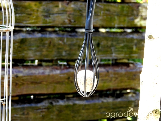 Mialam dosyc, tych wiszacych siateczek z kulkami pokarmowymi dla ptakow...Kupilam za grosze kilka ...trzepaczek i powsadzalam tam kulki Ptaki, nie dosc ze moga fajnie sie przytrzymac, to napewno nie zaczepia sie pazurkami w te okropne siateczki...Gdzies w internetach widzialam taka fotke...Sikorka pazurkami zaplatala sie w siatce i zdechla...Wiec im wymyslilam karmik- taki inny