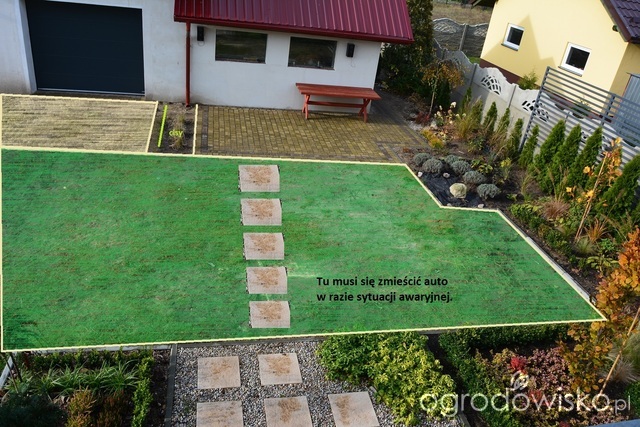 Jednak zimą nieco plany się zmieniły. Jestem za kostką na podjeździe do garażu, więc trawnik będzie mniejszy...