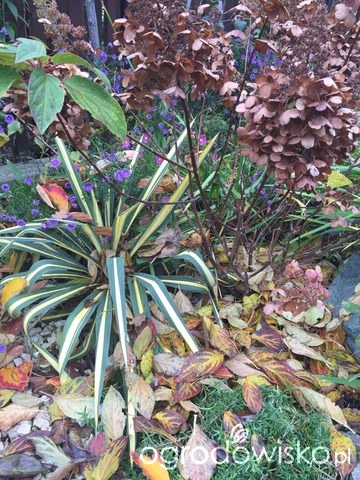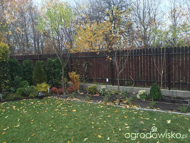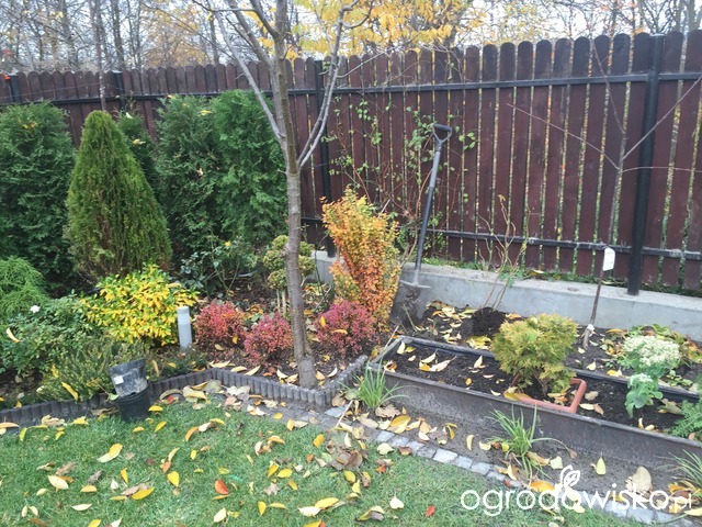 I nowa różanka. Na razie cała w liściach. Wszystko mam tak na dobrą sprawę w liściach, już 4 wory zebrane i oddane. 2 następne czekają. Róż nie widać bo przycięte i okopczykowane. Pewnie jeszcze przerabiać będę ale muszę zobaczyć najpierw jak róże się rozwiną. Teraz są wsadzone róże, tulipany, czosnki, bukszpan, tuja Mirjam zadołowana, krwawniki, rozchodniki i szałwie. Na tą rabatę finalnie z róż trafiły: Claire Austin, Augusta Louise, Candlelight, Benjamin Britten, Lady of Sharlott, Lady Emma Hamiltton, Wedding Piano, Jan Paweł II, Jude the Obscure i na razie cytrynowa NN, która na wiosnę zmieni właściciela. Na przodzie dałam tulipany i trawki. Jak tulipany przekwitną pójdą tu bratki. Rabata jest spora - 3,6 m szerokości x 1,5 m głębokości. Zastanawiam się co w drewnianych skrzynkach finalnie ma być. Chcę rozchodniki białe - właśnie je rozmnażam bo tylko 2 sztuki były w sklepie. Na płocie są dwie czereśnie Rivan. Ambitnie zamierzam je rozpiąć i formować w wachlarze. Z narożnej rabaty przylegającej do nowej różanki środkowa tuja Aurea Nana zostanie wyciepana jak się nie poprawi. Przycięłam ją w lato bo potwornie wielka się zrobiła. Ciekawe czy nie zmarźnie...no drażni mnie.