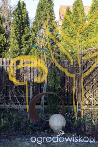 Zmiany przy tamaryszku. Przesadzona wisienka wczesna i dosadzony ambrowiec. Jak podrośnie - tamaryszek pójdzie pod piłę. Będzie to mniej więcej takie w kształcie. Ambrowiec prowadzę na płaski, owalny ekran stad już teraz jest formowany bambusami. Na kolorowo zmiany bo nic na zdjęciach nie widać w takim stanie. Jeszcze kanciki mi zostały i mycie oświetlenia. Strasznie wszystko zachodzi ;(