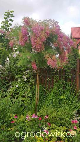 Goniu tamaryszek jest ładny w takiej formie drzewka. Ja mam francuski - później kwitnie i ma ciemniejsze kwiaty. Ale chyba z 6 lat trwało zanim doprowadziłam go do takiego stanu. Jak go wolno puścisz to takie niewiadomo co rośnie potwornie duże. Koszmar i bałagan. Na wakacjach zobaczyłam, że można prowadzić go inaczej i zakochałam się w takiej formie. On jest przycinany, wiązany i ciągle podpierany bo nadal wiotki i to bardzo. Wczoraj po deszczu mi się prawie połamał. Wyglądał tak.