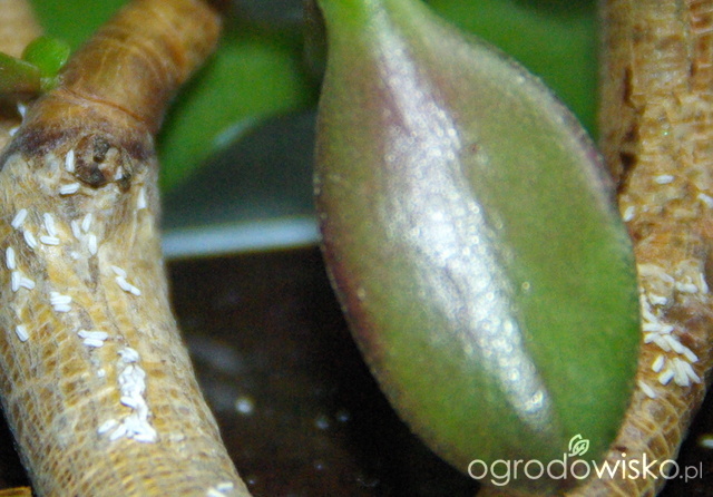 Na moim gruboszu pojawiły się dziwne maleńkie białe podłużne jajeczka. Przyczepinone są przeważnie w skupiskach do łodyg. Gdy je zauważyłam w zeszłym roku było ich tak dużo, że stworzyły na łodydze jakby skorupkę. Pryskałam roślinę dwukrotnie środkiem na mszyce i przędziorki nie wiedząc co to. Udało mi się usunąć większość tych jajeczek ręcznie i przez zimę był spokój. Teraz jednak znów się pojawiły najpierw kilka, po tygodniu kiladziesiąt a teaz jest ich pewnie kilkaset.